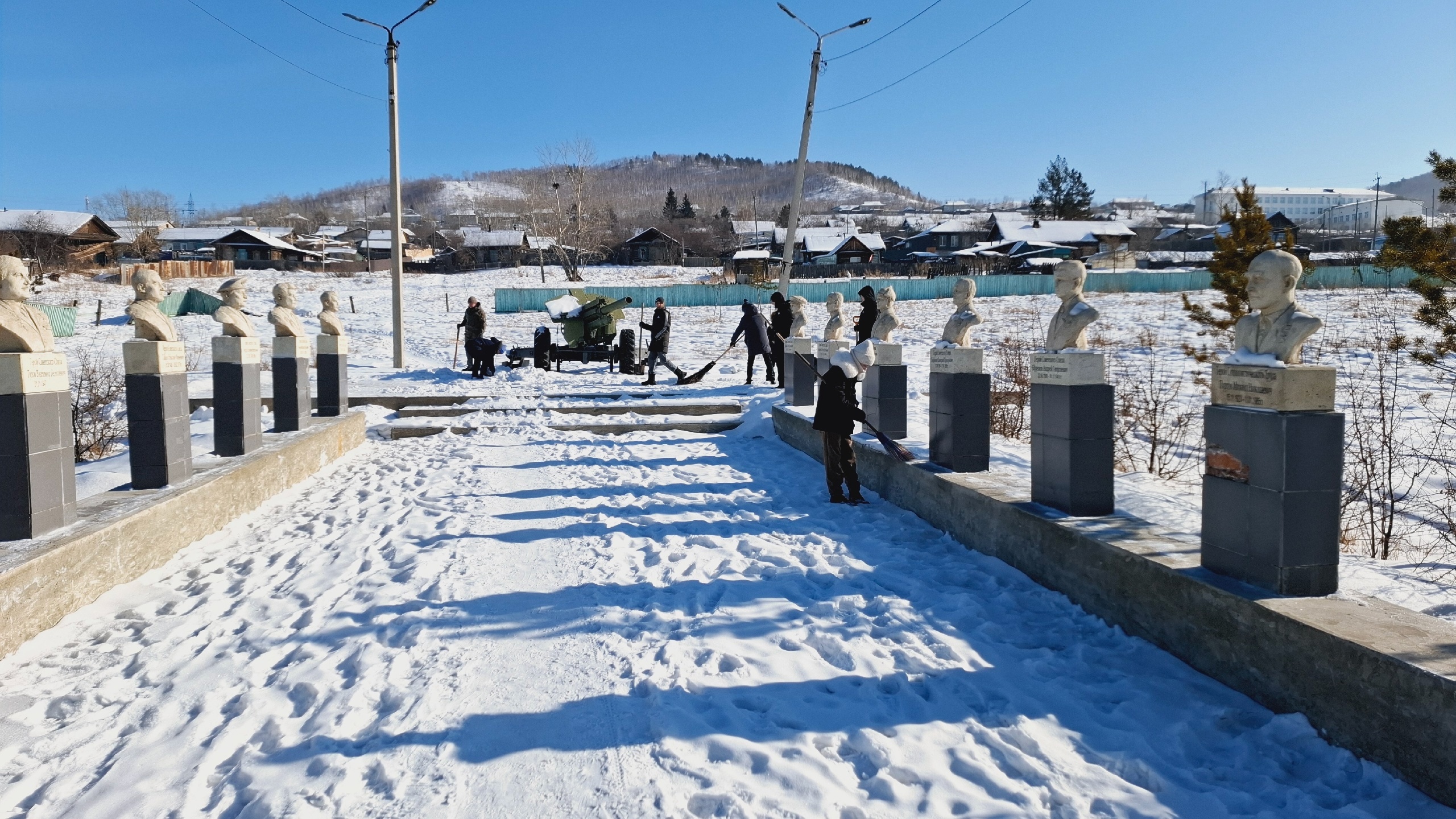 Вместе с руководителями отрядов ребята очистили от снега территорию около памятников погибших Героев Великой Отечественной войны и Специальной военной операции.